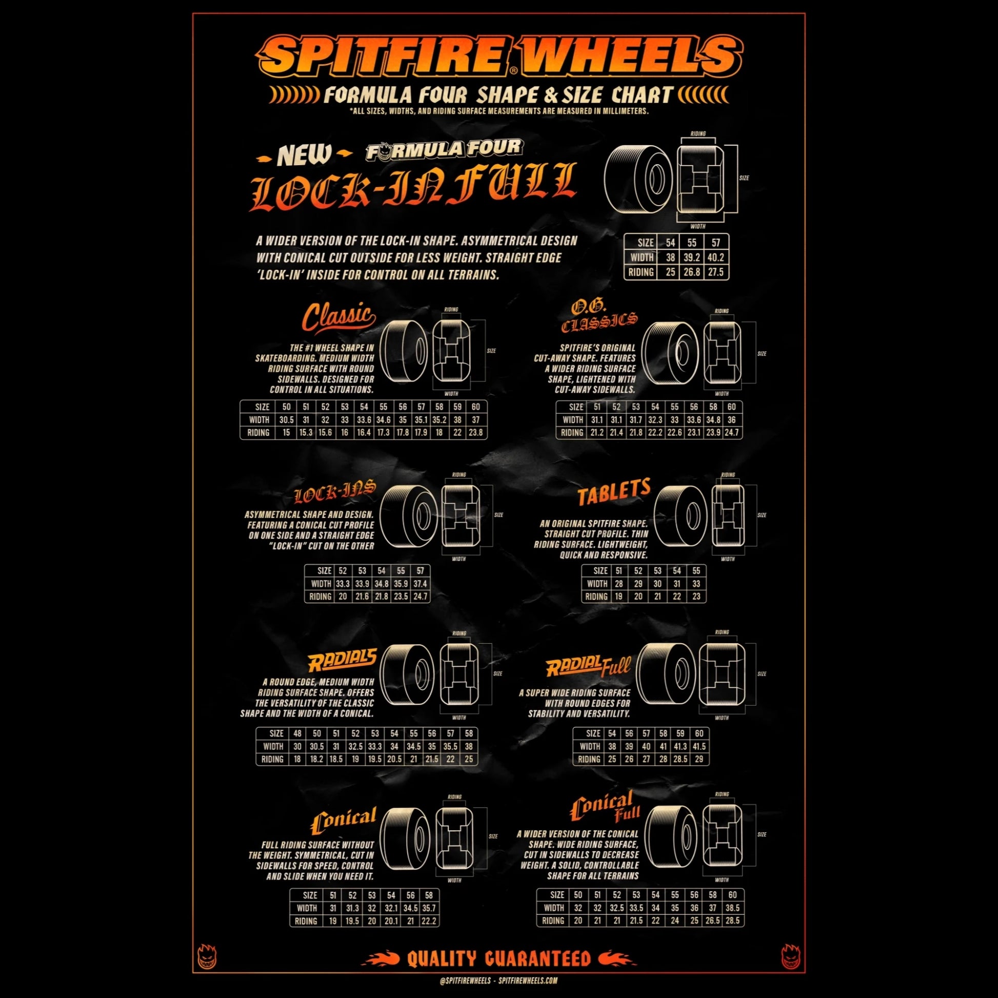 - Durometer: 99a Formula Four for fast roll and predictable slide
